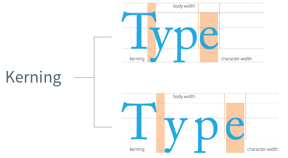 Kerning –  refers to the spacing between pairs of letters in the same word. Not all letters are created equal, so certain pairs of letters can appear to form an entirely different letter. For example, the word “learn” can appear to look like “leam” without kerning. With kerning, the designer can create an equal amount of space between letters for more easily readable text.